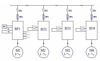 圖中:BP1—變頻器;BU2~BU4--軟起動(dòng)器,PT—壓力變送器。由圖一可見,變頻器連接在第一臺水泵電機(jī)上,需要加泵或減泵時(shí),由變頻器RO1~RO3端口輸出信號起動(dòng)或停止其他的水泵,這時(shí)水泵的起動(dòng)采用自耦降壓起動(dòng)裝置或軟起動(dòng)器。這種方案的特點(diǎn)是水泵電機(jī)不需要在變頻和工頻之間切換;第一臺水泵永遠(yuǎn)連接在變頻器上,沒有切換過程中的失壓現(xiàn)象;由于變頻泵以外的泵都有軟起動(dòng)器,所以不需要再做備用系統(tǒng),當(dāng)變頻器故障時(shí),可用軟起動(dòng)器手動(dòng)起動(dòng)M2~M4水泵,保證供水不致中斷;每臺電機(jī)都有起動(dòng)器,初始投資較大。另一種是“循環(huán)投切”方案,系統(tǒng)圖如圖二所示